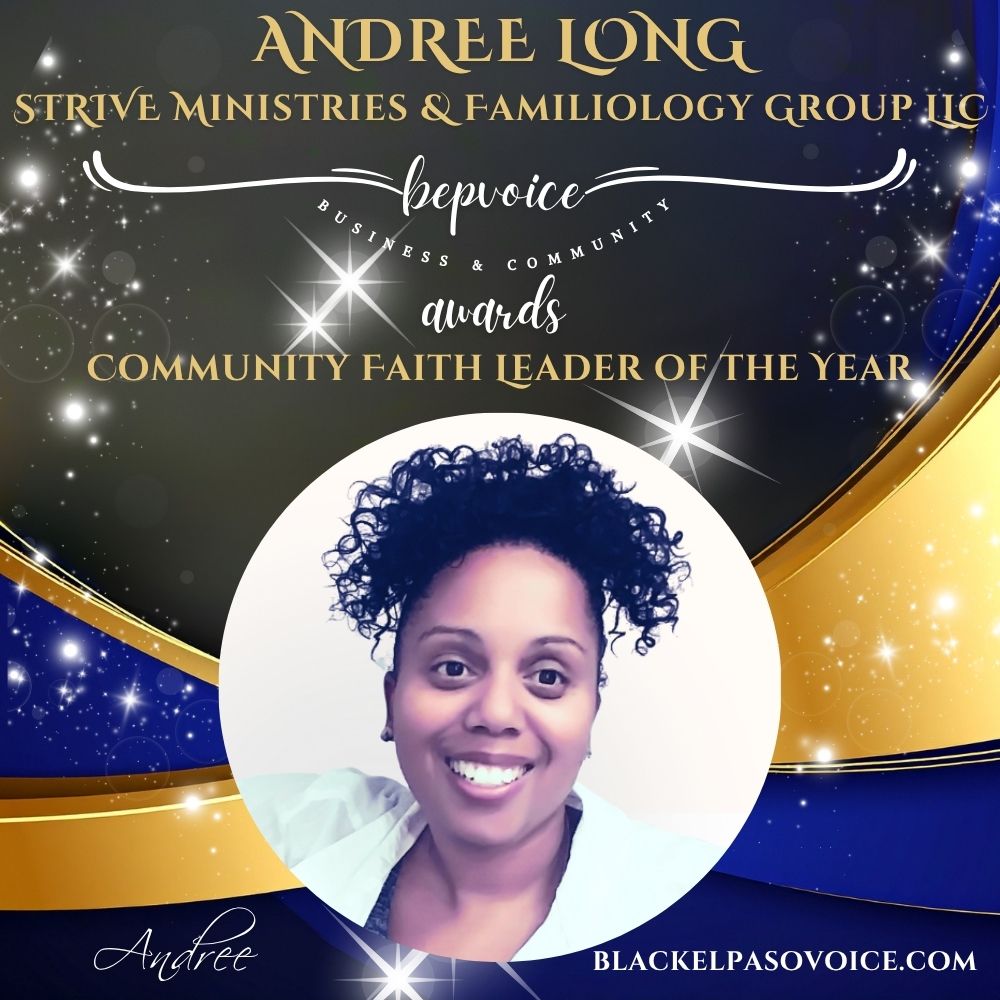 Her global travels and diverse experiences have enriched her understanding of thriving communities, allowing her to create environments where individuals can connect, share, and learn from one another. As an Army veteran spouse of 26 years and a devoted mother of two, Andree embodies the spirit of dedication and service. She is the founder and Executive Pastor of STRIVE Ministries and co-owner of a Family Consultant Center (Familiology Group LLC.)