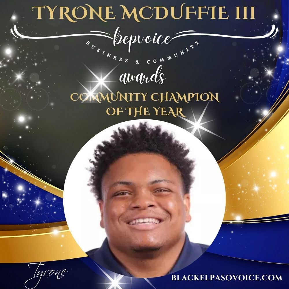 Although Tyrone cannot be here to receive this award in person, he would like to express his deepest gratitude. He credits the unwavering support of the El Paso community, his coaches, and his teachers for shaping his journey. Most importantly, he thanks his parents Tyrone D. McDuffie Jr. and Shakieasha McDuffie who are here to accept this award on his behalf.