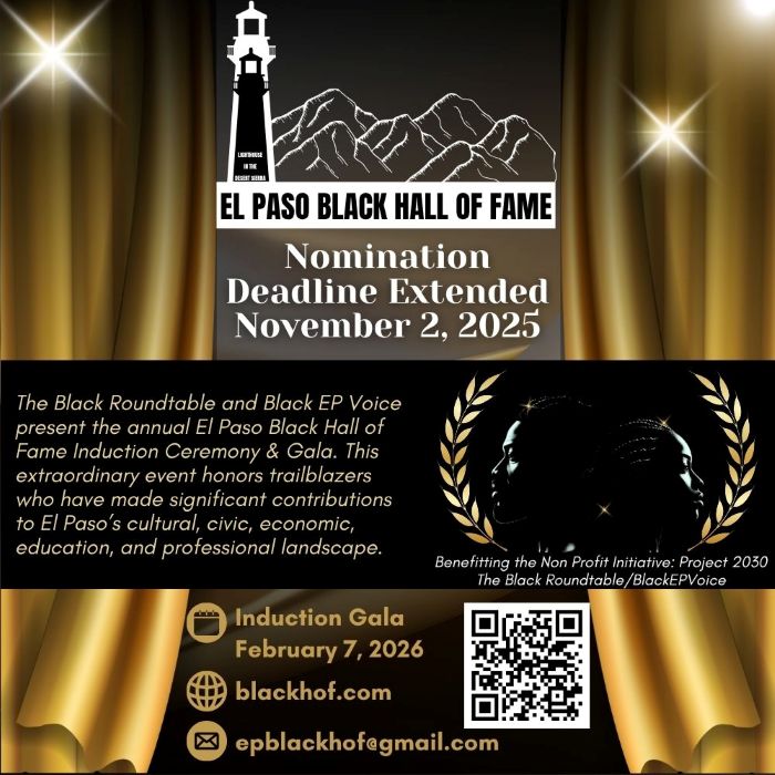 Nominations for the @epblackhof El Paso Black Hall of Fame are now open through Sunday, November 2! Help us honor #BlackLeaders and #trailblazers including BEPV’s 2025 Lifetime Achievement Awardee – Chief Jonathan Killings of EPFD, who are shaping our community, submit your nomination today. www.blackhof.com